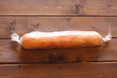 Avvolgi il salmone aiutandoti con la pellicola trasparente, arrotolando il lato lungo su se stesso fino ad averlo chiuso totalmente.