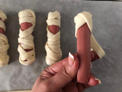 Una volta ottenute le strisce di pasta sfoglia, inizia ad arrotolarle sui wurstel: è un passaggio molto semplice, ma cerca di farlo senza mettere troppa sfoglia nello stesso punto lasciando dei punti irregolari, dovrai fare dei movimenti più o meno a spirale. Per avvolgere un wurstel ti serviranno due strisce, non dimenticarti di lasciare libero lo spazio per gli occhi