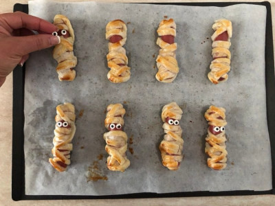 Aspetta che le tue mummie siano tiepide, poi con un puntino di maionese, attacca gli occhi di zucchero. Non importa se sono dolci, non inciderà sulla ricetta, è giusto per dare un tocco in più, ma se preferisci, puoi disegnare gli occhi con del ketchup o della senape e farai in ogni caso un figurone.
