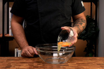 Per preparare i cantuccini di Prato, in una ciotola versa le uova e lo zucchero.