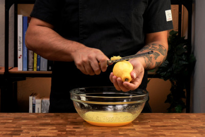Aggiungi la scorza di un llimone, la farina, il lievito in polvere, o l’ammoniaca per dolci, e mescola fino ad ottenere un impasto omogeneo e compatto.