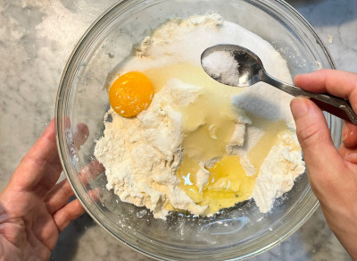 Unisci un uovo intero e il sale, profuma con la buccia grattugiata di mezzo limone biologico.