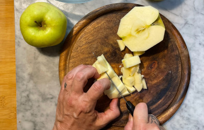 Monda le mele per la farcia della sbriciolata: sbucciale, privale del torsolo e tagliale a cubetti.