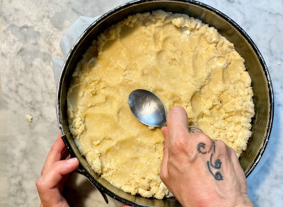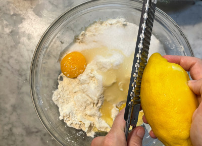 Lava un limone biologico e grattugiane la scorza equivalente a mezzo limone, uniscila al composto e impasta velocemente formando delle briciole. La frolla sbriciolata è pronta all’uso.