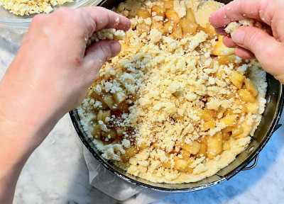 Cospargi le mele, e tutta la superficie della torta, con le briciole rimaste.