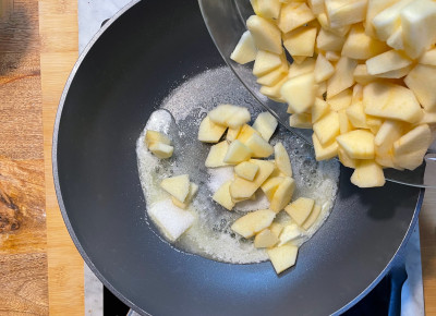Fai sciogliere il burro in una padella antiaderente, unisci li zucchero e mescola.