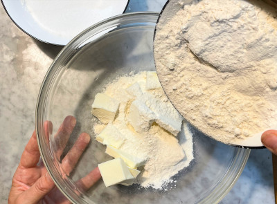 Prepara la frolla sbriciolata tagliando il burro freddo, a tocchetti, in una terrina, poi aggiungi la farina e con i polpastrelli comincia a mescolare formando delle briciole, infine aggiungi l’uovo e il sale.