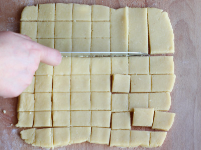 Crea uno strato alto circa 1 cm. Taglia delle strisce larghe circa 1-2 cm e poi ottieni dei quadratini.