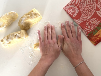 Mescola tutti gli ingredienti con una mano fino a farli amalgamare e forma un panetto che trasferirai su un piano da lavoro infarinato.