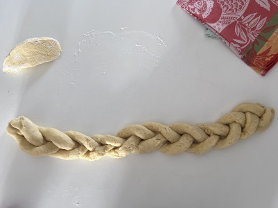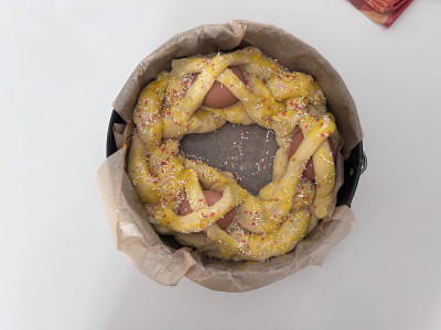 Intreccia i cordoncini d’impasto fra loro e trasferisci la treccia così ottenuta in uno stampo da 24 cm rivestito con carta forno.