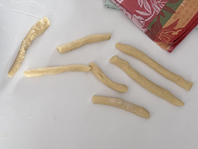 Dividi l’impasto in 4 parti, mettine una da parte e, con le altre tre parte di impasto, forma dei cordoncini abbastanza lunghi da coprire il perimetro dello stampo che hai scelto.