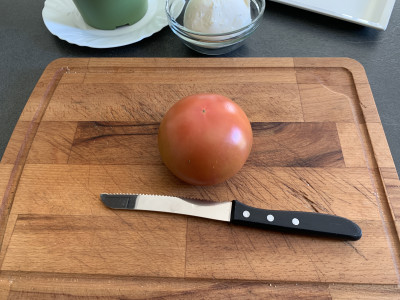 Lava i pomodori ed affettali, presta attenzione a realizzare delle fette regolari, infatti pur essendo una ricetta davvero semplice, l'occhio vuole la sua parte e quindi va composta bene per servirla in tavola.