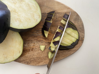 Per prima cosa friggi le melanzane, questa è la parte più lunga di tutto il procedimento, quindi va fatta subito.