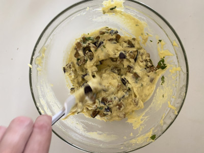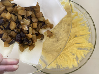 Ora che l’impasto è pronto, aggiungi le melanzane fritte e una manciata di mentuccia fresca, tritata.