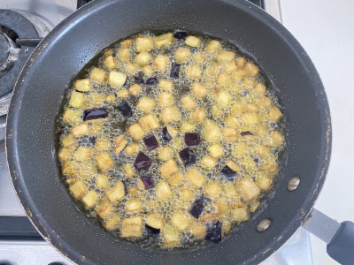 Man mano che si dorano, riponi i cubetti di melanzana su dei fogli di carta assorbente che avrai sistemato in un piatto o in una ciotola.