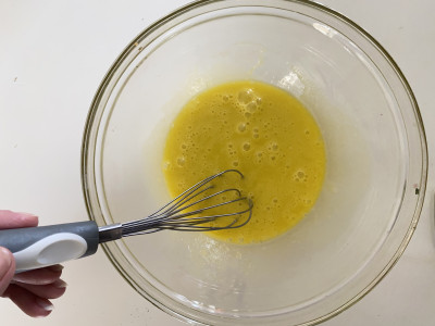 Adesso occupati dell’impasto dei muffin: in una ciotola sbatti le uova con l’olio fino a creare quasi una sorta di maionese liquida. Metti la farina in un’altra ciotola, aggiungi il caciocavallo grattugiato e una presa di sale.