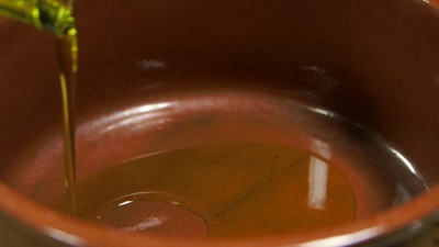 Scalda un bel giro d'olio extravergine d'oliva in un tegame di terracotta, prepara un trito con il sedano, la carota e la cipolla ed uniscilo all'olio nel tegame., fai andare con fiamma vivace per qualche minuto.