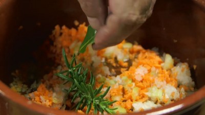 Quando le verdure hanno preso bene calore aggiungi anche il rosmarino e la foglia d'alloro, lascia soffriggere fino a che le verdure non saranno appassite e poi aggiungi la pancetta tagliata a cubetti grossolani. Cuoci fino a che il grasso della pancetta non sarà diventato trasparente. aggiungi anche la carne macinata e cuoci fino a che non avrà cambiato colore.