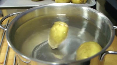 Nel frattempo mettete a lessare le patate in abbondante acqua bollente, quando saranno cotte (prova ad infilzarne una con una forchetta, se la forchetta entra senza resistenza vuol dire che sono cotte) scolale, aspetta qualche minuto e poi togli la buccia.
