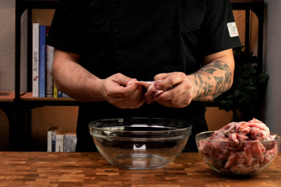 Posiziona la carne in una ciotola insieme ad una cipolla bianca tagliata a pezzi, una carota anche lei tagliata a pezzi e un limone tagliato a metà.