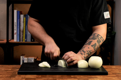 Taglia le cipolle a metà e poi a fette di circa 1 cm di spessore.