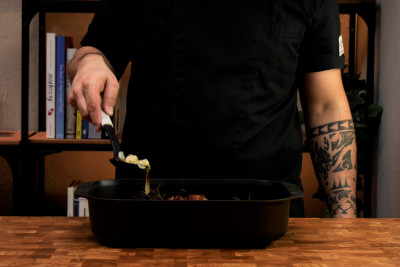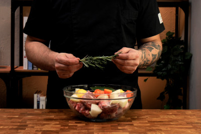 Aggiungi una foglia di alloro e un paio di rametti di rosmarino Poi versa nella ciotola il vino bianco e aggiungi acqua sufficiente per coprire la carne.