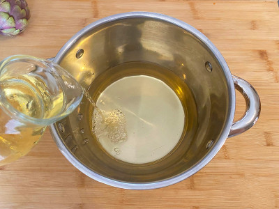 Nel frattempo che la soluzione di vino e aceto giunga a temperatura, pulisci i carciofi togliendo le foglie esterne più dure, procedi nell'eliminazione fino a raggiungere il cuore del carciofo.