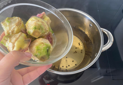 Tuffa i carciofi in vino e aceto e lasciali cuocere per 5 minuti, poi scolali con un mestolo forato e mettili a testa in giù su un canovaccio pulito, lasciali raffreddare così per almeno 3 ore.