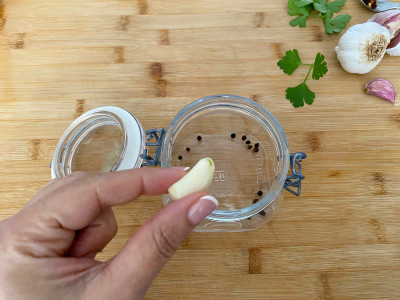 Nel vasetto precedentemente sanificato secondo le linee guida del ministero della salute, metti una manciata di pepe nero in grani, lo spicchio d’aglio, il peperoncino e il prezzemolo.