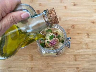 Riempi il barattolo con olio extra vergine d’oliva avendo cura di coprire completamente i carciofi, prima di chiudere i barattoli aspetta almeno un'ora perché l'olio insilandosi tra i petali dei carciofi potrebbe calare di livello, a quel punto rimboccane un po'.
