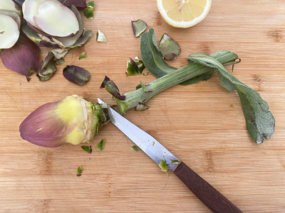 Rifila ogni carciofo in cima: con un taglio netto togli le punte spinose. Pareggiali alla base togliendo il gambo, strofinali con il limone e, man mano che li pulisci, mettili in ammollo in acqua e limone.