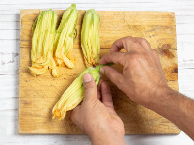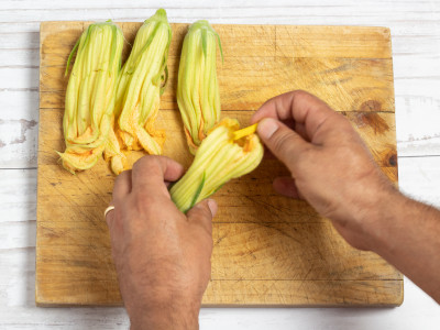 Nel frattempo che attendi i tempi corretti per il riposo della pastella, occupati della pulizia dei fiori di zucca, stacca il gambo, e con le mani tira via i pistilli esterni.