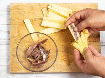 Estrai anche Il bocciolo interno. Taglia il caciocavallo a listarelle e appoggia su ognuna di esse mezza acciuga.