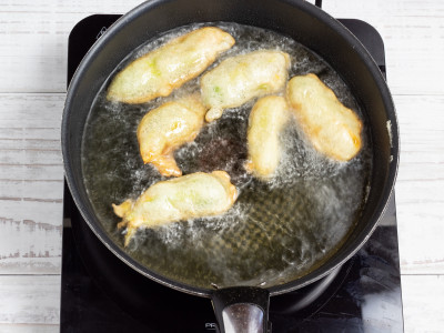 Riempi il fiore di zucca e chiudi arrotolando leggermente l’estremità del fiore. Passati i 30 minuti di riposo della pastella, immergici velocemente il fiore di zucca ripieno.