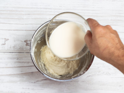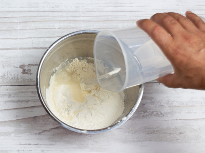 In un’altra ciotola versa la farina e la restante acqua, mescola con una frusta fino ad ottenere un composto liscio.