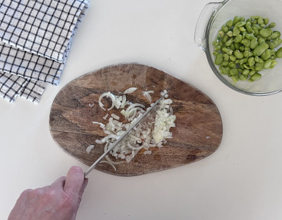 Trita finemente la cipolla, falla appassire in padella poi unisci le fave e lascia cuocere per circa 5 minuti, poi spegni la fiamma e lascia intiepidire.