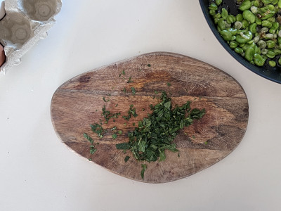 Trita finemente qualche ciuffo di mentuccia, in una ciotola sguscia le uova, condisci con il formaggio grattugiato, un pizzico di sale, pepe nero e la mentuccia tritata. Sbatti bene con una frusta per far amalgamare il composto, poi unisci anche le fave.