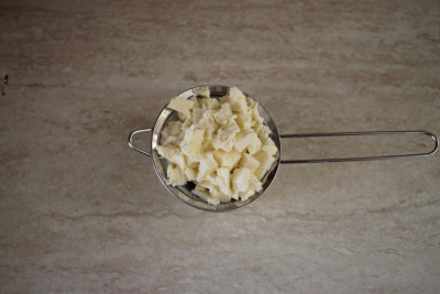 Per prima cosa taglia la mozzarella a cubetti e mettila a sgocciolare dentro uno scolapasta o un colino.