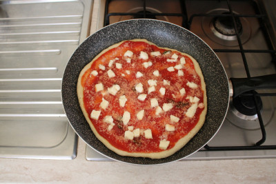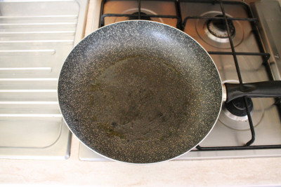 Ungi con poco olio di oliva una padella antiaderente del diametro di 30 cm. in modo che la pizza non vada a curvarsi sui bordi ma copra solo il fondo, e falla scaldare molto bene.