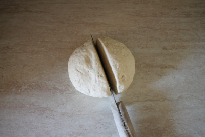 Dividi l'impasto in due parti uguali e allargarle con le mani, poi stendile con un mattarello, fino ad ottenere due dischi del diametro di circa 26 cm.