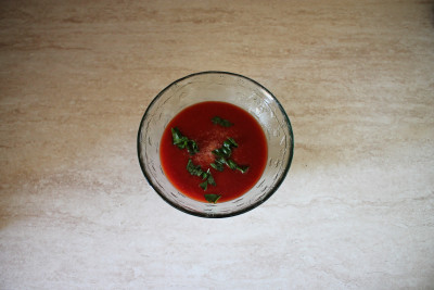 versa in una ciotola la passata di pomodoro e insaporiscila con un pizzico di sale e le foglie di basilico precedentemente lavate e tagliate a pezzetti.