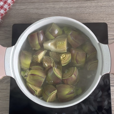 Cuoci i carciofi in acqua bollente fino a quando saranno morbidi, ci vorranno circa 15 minuti.