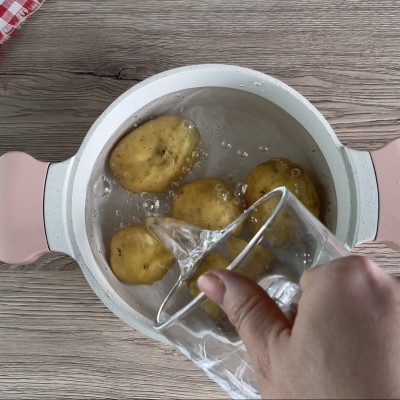 Metti dell'acqua fredda in un tegame capiente, aggiungi le patate con la buccia e accendi il fornello, dal bollore conta circa 35 minuti per la cottura delle patate, prima di scolarle prova ad infilzarle con i rebbi di una forchetta, se trovi resistenza fai cuocere per ulteriori 5 minuti. Quando le patate saranno cotte, scolale, sbucciale e tagliale a pezzi.