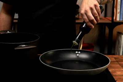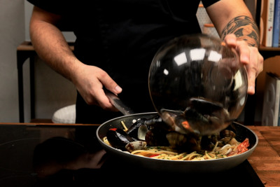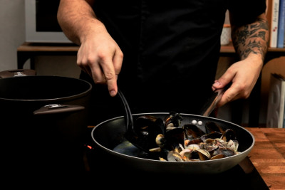 In una padella versa un filo d’olio abbondante, uno spicchio d’aglio, le vongole che avrai scolato dall'acqua in cui le hai tenute in ammollo, e le cozze. Copri con un coperchio e lasciale aprire a fuoco vivace per un paio di minuti.