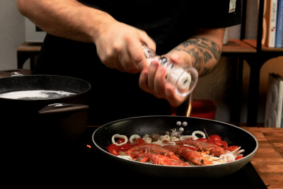 Adesso aggiungi i gamberi, aggiusta di sale e pepe e lascia cuocere i gamberi un minuto per parte. Scola gli spaghetti al dente e mettili direttamente nella padella, mescola il tutto per bene in modo che il condimento si amalgami bene con la pasta. Infine aggiungi una spolverata di prezzemolo tritato.