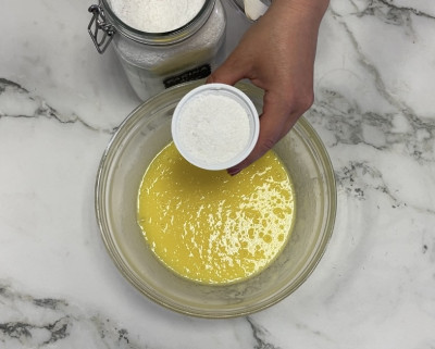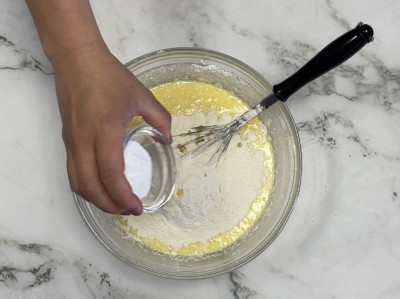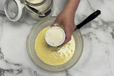 Sguscia le uova e aggiungile agli altri ingredienti, poi mescola con una frusta a mano.