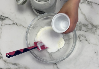 Usando il vasetto come misura, aggiungine 2 pieni di zucchero e mescolalo con lo yogurt.