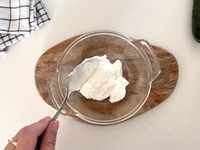 Trasferisci lo yogurt greco in una ciotola, aggiusta di sale, aggiungi un giro d’olio e lavora con un cucchiaio o con una forchetta per far amalgamare bene, poi unisci anche l’aceto.