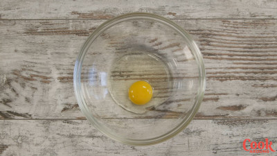 Prepariamo i pancakes alla frutta fresca e sciroppo d'acero: rompi l'uovo e fai ricadere il tuorlo e l'albume in una ciotola, controlla bene che non vi siano pezzettini di guscio, in caso rimuovili con una forchetta.