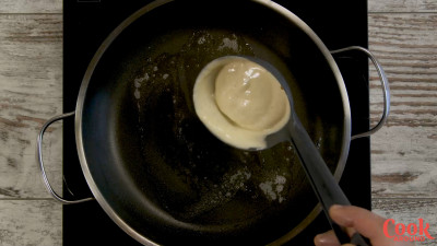 Scalda un pezzettino di burro in una padella piatta e antiaderente, o se la possiedi, in una padella per pancake. Con un pezzo di carta assorbente, rimuovi il burro in eccesso, ce ne dovrà essere giusto un velo, quindi versa un mestolo scarso di pastella.